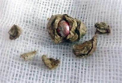 ????石頭取出來后,李明華用血管鉗敲了敲,外邊竟然掉下了一層,隨后他使勁一敲,外邊的殼全掉了下來,里邊還包著一個褐色的東西。“里邊這個東西是個珠子?!崩蠲魅A推測說,可能當(dāng)年,劉青把這顆珠子塞進了鼻孔,當(dāng)時沒有取出來,時間長了在里邊形成了結(jié)石。 (記者 陳珂 攝影報道)