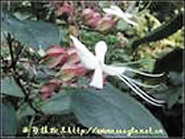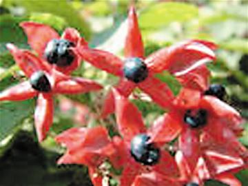 ????3、(投票選號133)學名:海州常山,別名:臭梧桐、紅五星。落葉闊葉類小喬木,或呈灌木狀,高可達8米。單葉對生 。傘房狀聚傘花序著生頂部或腋間,花冠細長筒狀,白色或粉紅色。核果球狀,熟時紫色。整個花序可同時出現紅色花萼、白色花冠和藍紫色果實的豐富色彩?;ㄆ?-7月,果期10-11月。