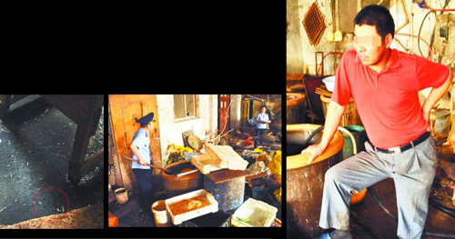 ????“如果親眼目睹這家黑豆腐坊生產(chǎn)出來的臟豆腐,就再也不想吃豆腐了!”近日,有讀者反映,在長沙路和勁松三路交會處一廢棄廠房內(nèi),隱藏著一個黑豆腐作坊。本報記者利用9月15日、16日兩天時間進行了暗訪,這個黑作坊內(nèi)環(huán)境差得令人作嘔:加工間內(nèi)滿地臭水;生產(chǎn)豆腐的豆子和垃圾放一起;豆腐泡在污水里,用發(fā)霉的筐子盛放;蛆蟲爬、蒼蠅飛……記者采訪了解到,這個作坊生產(chǎn)的黑豆腐都流向了附近的市場和小飯店。目前,合肥路工商所執(zhí)法人員已就此進行了查處 。