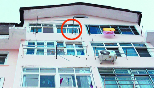 萬女士從七樓(紅圈處)墜下時,砸斷了六樓的晾衣架。