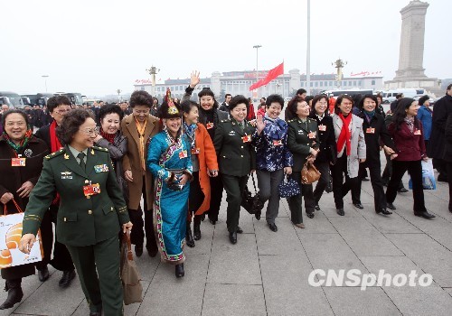 資料圖片:在“三八”婦女節即將來臨之際,全國政協十一屆三次會議第二次全體會議3月7日在人民大會堂舉行。出席會議的女委員們紛紛接到男委員們提前送來的節日祝福,臉上洋溢著節日的喜悅(中新社發 湯彥俊 攝)