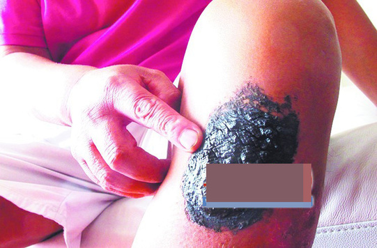 ????19日上午,根據(jù)目擊市民提供的出租車號(hào),記者在合肥路一小區(qū)輾轉(zhuǎn)找到了這位被咬傷的的哥?!靶姨澕皶r(shí)把它從衣服里拿出來(lái),要不就會(huì)在我身上多咬上幾口,那樣我就累了!”說(shuō)起18日晚上的那一幕,的哥齊師傅仍心有余悸。記者看到,齊師傅左膝蓋下的傷口上涂上了黑色的解毒藥膏。