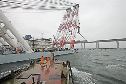 ????昨日下午,在海灣大橋滄口航道橋東側一段,2600噸起重船 “四航奮進號”將海灣大橋最后一片60米預制箱梁吊裝到位。據介紹,60米整孔預制箱梁,頂板寬17米,底板寬6.6米,高3.5米,重量約2050噸,在中國同類結構橋梁中排在前列,為長江以北最大的整孔預制箱梁,預制和架設過程技術要求高,施工難度大。其吊裝高度超過杭州灣大橋,為目前國內特大預制安裝箱梁的最大高度。