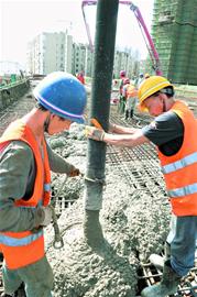 ????云南路主線高架共有6聯主橋。昨天開始澆筑的是云南路主線高架1號橋,也是最緊鄰快速路三期的一聯橋。記者上午11點趕到作業現場,工人們正在進行第3層混凝土澆筑。4名工人引導兩臺泵車通過導管向箱梁澆筑混凝土,流出的混凝土被工人迅速導入箱梁中,隨后再被振搗機均勻下引,確保澆筑的密實度。據項目相關負責人介紹,整個澆筑作業分6層進行,每層澆筑混凝土30-40厘米,24小時將澆筑混凝土1280立方米。作業完成后,箱梁厚度將達到2米。