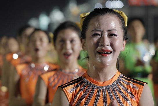 ????廣場兩邊豎起的大型電子屏幕用視頻生動具體地展示了這些成就。廣場中央,身著鮮艷傳統服裝的朝鮮群眾用手中的花束、彩帶等道具,組成各式各樣的圖案和造型,配合著電子屏幕中的影像變換著場景。