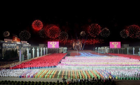 10日晚,朝鮮首都平壤,霓虹燈將大街裝飾一新,著名景點的周身被探照燈照亮;金日成廣場,焰火繁花似錦,群眾方陣用道具模擬出各種圖案和造型。朝鮮勞動黨建黨65周年慶祝活動在這里舉行,今晚的平壤變成名副其實的不夜城。