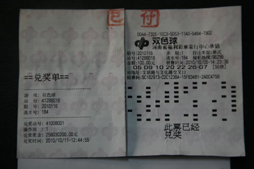 ????河南福彩中心今日下午召開新聞發布會,河南省彩票新聞發布中心主任李云昆表示,2010年10月5日14時23分56秒,駐馬店彩民單式50倍倍投獲得雙色球2.58億元大獎,中獎得主11日與福彩中心取得聯系,辦理兌獎手續。兌獎過程中,主動自愿的表示將所中的的獎金中捐獻出1050萬,具體事宜委托河南省福彩中心辦理,免除捐贈者捐款部分所得稅,最終繳納所得稅為4950.64萬元。得主從事教育工作,長期堅持購彩,不僅買雙色球,而且經常購買其他類型的福利彩票,并且中過為數不等的獎金。本次為機選購買。