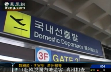 韓國首次發生乘坐郵輪到濟州島的中國內地游客脫團事件,目前仍有33人未能找到,當地警方加強在機場、港口等地的追查,不過早上在濟州島的機場,氣氛如常,除了韓國本土游客,還可以看到不少內地旅行團出入境。中國駐光州領事館得到通報,由於估計是有蛇頭組織的脫團行動,11名在昨天被找回的脫團旅客,還在被當地出入境管理部門扣查,稍後才會遣返。這11人來自吉林,山東,河南及河北等多個省份。