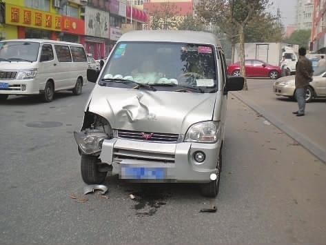 撞倒老人的面包車車頭已變形(趙波 攝)