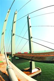 ????大橋的橋面寬度為35米,為雙向六車道。由于橋面上還有人在施工,我們行車的速度并不很快,平坦的橋面讓乘車的人感受到了舒適。行駛了大約2公里之后,看到了紅島航道橋高高的索塔。紅島航道橋是一座鋼箱梁獨塔斜拉橋,是海灣大橋的三個航道橋之一。