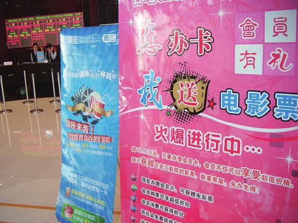 ????“兩張電影票+兩杯可樂共36元”,3日上午,百麗廣場三樓百老匯影院外面的易拉寶廣告牌吸引了不少人的眼光。據(jù)工作人員介紹,這是百老匯正在與滿座網(wǎng)開展的看電影團(tuán)購活動(dòng)。而此時(shí),福州南路的大屏幕上,也不時(shí)閃現(xiàn)著華臣影院4周年店慶的廣告。“零售及普卡會(huì)員全天30元金卡會(huì)員25元”的字樣也讓一些年輕人駐足。萬達(dá)影城網(wǎng)站上也掛出了本月為電影月的宣傳條幅。一時(shí)間,島城高端影院的價(jià)格競爭似乎全面展開了。