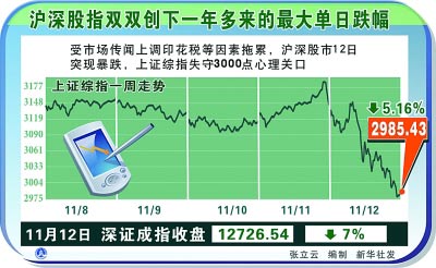 ????亞運會還沒開幕,A股就拿了個“跳水冠軍”!這是昨天收盤后,股民們苦笑著互相調侃的段子——昨日,一則“莫須有”的印花稅將上調傳言引爆了A股市場積累已久的所有下跌因素,結果兩市出現罕見大幅下挫。滬指收盤暴跌5.16%,跌破3000點這一重要心理關口。由于恐慌性拋盤,兩市成交總量接近5400億元,逼近11月2日創下的歷史最大單日成交量。股民哀嘆,兩個月的收益,一天就跌沒了!