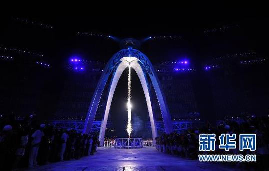 ????11月12日,第16屆亞洲運動會開幕式在廣州海心沙島舉行。這是主火炬點燃過程。 新華社記者陳曉偉攝