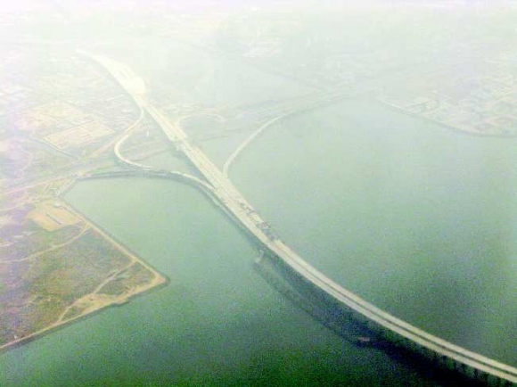 ????12日,記者乘坐飛機(jī)途經(jīng)李村河口附近,正在建設(shè)中的海灣大橋猶如一條巨龍橫臥在膠州灣。據(jù)介紹,海灣大橋?qū)⒂诮衲甑兹€貫通,明年上半年正式通車。建設(shè)中的海灣大橋全長(zhǎng)41.48公里,是目前世界上最長(zhǎng)的跨海大橋,建成后將青島到黃島的時(shí)間縮短為30分鐘。(記者 楊寧 攝影報(bào)道)