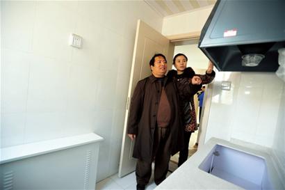 ????47歲的項本勝和妻子走進9號樓一套三居室戶型,近50平方米的房間已經完成精裝修,廚房、衛生間地面和墻上都鋪好了瓷磚,客廳臥室地面鋪有復合地板。“這些灶具別的房子都有吧。”看到廚房中的一體櫥柜、打火灶、吸排油煙機,項本勝有點不相信廉租房會有這么齊全的設施,在得到工作人員的肯定回答后,兩口子樂得合不攏嘴。