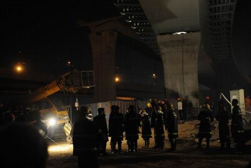 據(jù)現(xiàn)場民工說,有數(shù)名在橋面作業(yè)的工人被埋入廢墟中,由于搜救犬在現(xiàn)場未能找出生命跡象,現(xiàn)有關(guān)方面正在討論方案,如何吊起倒塌大梁,以確定底下是否有人。消防官兵仍在待命,準備隨時投入搜救工作。