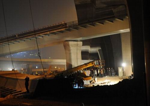 該段高架橋東起寧溧公路、西至濱江大道的緯九路,是連接南京河西新城與主城、江寧的一條重要通道。據(jù)悉當時此段橋面正在進行路面混凝土澆灌,突然發(fā)生整段橋面垮塌,在橋面作業(yè)的民工均從空中墜落,并被埋入廢墟中。