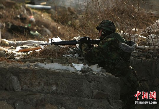 11月28日,在韓國首都首爾西南約170公里的一處海灘,韓國士兵在參加登陸演習前進行訓練。韓國和美國當日開始在韓國西部海域(黃海)舉行聯合軍事演習。此次聯合軍演將持續4天。