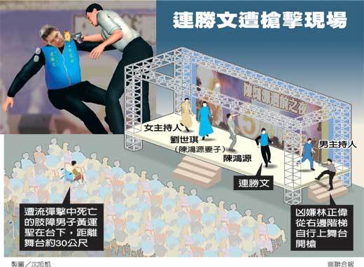 ????神秘男子昨出面向檢警說明,案發前他站在舞臺旁邊抽煙,發現林嫌向現場支持者借帽子、背心后,蹲在舞臺階梯旁,行跡鬼祟。他一度懷疑是小偷,所以特別注意其一舉一動。當晚8時許,連勝文抵達現場,與陳鴻源等人站在舞臺上接受支持者歡呼,在歡聲雷動之際,林嫌拔槍往舞臺移動,他看見槍立即跟上前,但距林嫌約四、五步時,林嫌突然用左手勒住連勝文脖子,右手持槍抵住連勝文頭部,兩人激烈拉扯,突然槍聲一響,連勝文滿臉鮮血倒地。