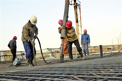 ????記者首先來到莘縣路靠近廣州路路段,這里是東西快速路三期工程的南端。一東一西兩臺超大型泵車伸出“大力神臂”,舉向20多米高橋面,向已綁扎好的鋼筋箱梁體內灌注混凝土。橋面上,10多名工人操縱泵車有序地澆筑著。