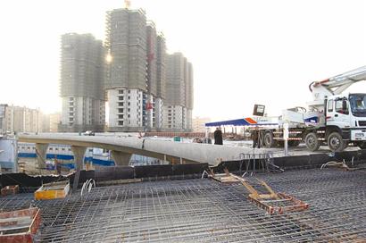 ????記者首先來到莘縣路靠近廣州路路段,這里是東西快速路三期工程的南端。一東一西兩臺超大型泵車伸出“大力神臂”,舉向20多米高橋面,向已綁扎好的鋼筋箱梁體內(nèi)灌注混凝土。橋面上,10多名工人操縱泵車有序地澆筑著。