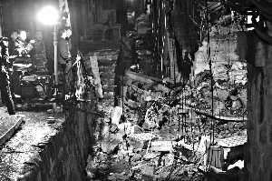 12月5日,武警戰士在事發現場警戒。當日,貴州省凱里市網吧爆炸事件的原因已初步查明,為網吧隔壁一出租屋內存放的危險化學品發生爆炸引發