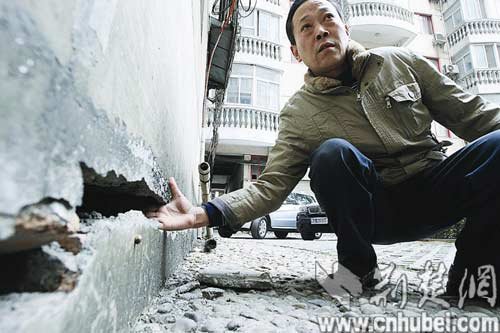 昨日下午,記者接到漢口香港路九運長福公寓居民的求助后,來到現場查看。只見這是一棟14層高的商住兩用樓,共6個單元,樓內住有148戶居民。記者在樓內眾業主的帶領下,在該幢樓3單元與4單元間看到,一面墻的墻腳裂開有20多米的縫隙,裂縫大的竟可以塞進一個拳頭。受墻體裂縫影響,物業公司設在一樓的保安室內的一個木門,已經嚴重變形;一樓的幾間商鋪也因墻面出現裂縫,商鋪的門都無法正常開關。