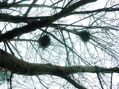 ????在這條400米長的街上,記者發現了十多個喜鵲窩。看見這么多鳥窩,不少經過此處的路人都忍不住抬頭多瞧幾眼。 “郊區和農村鳥窩多不奇怪,在市中心這么繁華的地方有這么多鳥窩,還真有點稀奇。”路過的市民童先生說。這些喜鵲窩都筑在十七八米高的地方,有的四個窩筑在一棵樹上,有的筑在居民區里的老槐樹上,還有的距離居民窗戶僅有四五米遠。正如李老先生所說,居民打開窗戶就能跟喜鵲鄰居聊天。