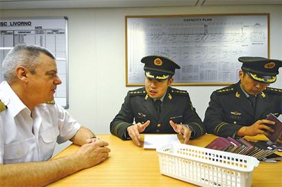 ????昨日上午,記者在前灣港82號泊位見到了 “地中海·利沃爾諾”,并跟隨黃島邊檢站工作人員登船。據(jù)該船船長勒夫勒介紹,這艘貨輪隸屬于“地中海”航運公司,德國籍。
