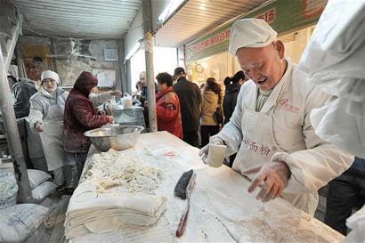 ????樂陵路一家餃子館索性把冰柜搬到門外,掛出“冬至生餃子大賣”的橫幅。“來買生餃子的人太多,耽誤店里面的生意,干脆在街上賣還方便。”正在給顧客裝生餃子的服務員告訴記者,他們店平時主要是賣煮熟的餃子,客人都是在店里吃,很少有人把生餃子買回家。冬至一早就有顧客上門買生餃子,餃子館也樂得接待,同樣的一盤餃子,生熟的價格都一樣,餃子館還省了燃氣和加工費。記者在其他飯店了解到,從冬至前一天開始,就有許多市民前來訂購手工包制的生餃子。(趙健鵬 程泉 攝影報道)
