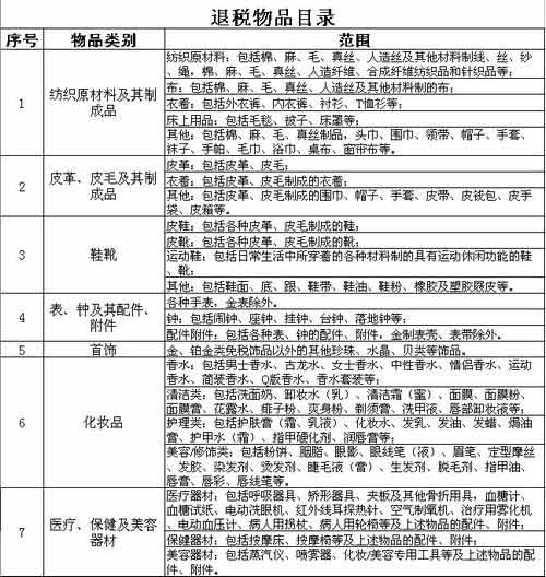 ????(四)退稅物品。退稅物品是指國(guó)家允許攜帶出境并享受退稅政策的個(gè)人生活物品,但食品、飲料、水果、煙、酒、汽車(chē)、摩托車(chē)等不包括在內(nèi)。退稅物品目錄詳見(jiàn)附件。