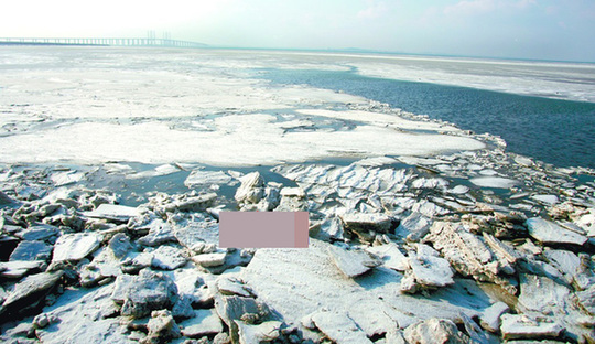 ????記者從海灣大橋滄口航道處看到,遠處的海冰從岸邊的礁石處正逐漸向大海深處“蔓延”。從環膠州灣大道上向西望去,“冰蓋”綿延近五六百米,與前幾天海冰剛剛“初生”相比,目前“成長”的速度明顯快了不少。記者觀察發現,漫長的“冰蓋”在時而透過云層的陽光照射下白花花的,為了不被影響到視線和注意力,不少從沿路行駛的駕駛員經過時都注意放緩了車速。
