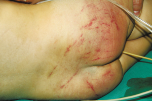 圖為女嬰的臀部、大腿受傷。記者 查鍇 攝 昨日下午5時20分,一輛急救車呼嘯著將2歲半的女嬰琪琪(化名)送到廣州軍區武漢總醫院。經診斷,琪琪顱內出血,病情嚴重,醫院下達病危通知書,立即進行開顱手術。令醫生奇怪的是,女嬰竟遍體鱗傷。 據了解,琪琪是江西贛州人,今年2歲半,昨日下午送到醫院時處于昏迷狀態。醫生檢查發現,其雙側瞳孔對光反射遲鈍,后腦勺處有血腫,雙側面部血腫,屁股和會陰部有大面積的紅腫,兩個胳膊和雙大腿都有傷痕,有些已呈陳舊型,CT檢查顯示,其顱內出血。鑒于病情嚴重,醫院已經下達病危通知。 廣州軍區武漢總醫院立即開通綠色通道,麻醉科、神經外科的專家聯手為其進行開顱手術。手術醫生介紹,琪琪身上的多處傷痕不可能是摔傷所致。 昨晚,記者與琪琪的父親董先生取得聯系。董先生遠在江西,他已經得知女兒入院急救的情況,正在來漢路上。董先生與妻子在江西老家的一家家具廠上班,夫妻倆育有3個子女,琪琪排行老二。去年9月,琪琪被接到武漢魯磨路附近的姑媽家居住。對于女兒的傷情和原因,董先生并不知情,當他得知女兒遍體鱗傷,他表示難以置信。 隨后,記者找到琪琪的姑媽董女士。董女士稱自己沒有上班,一直在家帶孩子,自己的孩子已經7歲。董女士稱,琪琪是不小心摔傷了腦袋導致顱內出血。 記者詢問琪琪身上的多處傷痕是怎么回事?董女士這才承認:“因為琪琪有時將屎尿拉在褲子上,自己一氣之下,才打了琪琪,但頭上的傷是琪琪自己摔傷的。” 截至昨晚9時記者發稿時,手術仍在緊張進行中。(記者 查鍇) |