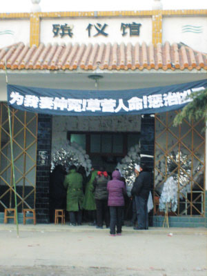 “沒有的事,我們從來就沒接受這一說法。”李莉生前的一名鄰居搖頭對記者說。他指著殯儀館門口懸掛的寫有“草菅人命,懲治兇手”等黑色大字的白色橫幅介紹說:“我們在殯儀館住了三四天了,就是希望能夠有一個公道的說法,希望能夠懲治兇手,告慰死者?!?/p>