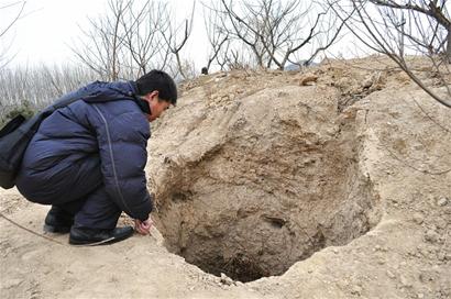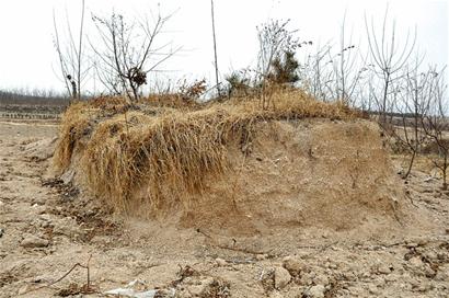 ????昨天上午10時(shí)許,記者來(lái)到膠南市土山屯村東面的“土山屯漢墓群”。在村民的指引下,記者在南面的一座古墓上看到,墓北側(cè)有一個(gè)直徑在一米左右的洞,洞體呈圓形,洞外還留有扒出來(lái)的土,附近還有幾塊表面為條紋狀的殘碎陶片。“這個(gè)洞口肯定是盜墓賊留下的,要不然誰(shuí)閑著沒(méi)事在上面挖洞。”土山屯村民盧老漢告訴記者,前一陣子他給麥地澆水的時(shí)候,這個(gè)地方還好好的,可是上個(gè)月他到地里查看旱情走到這里,就發(fā)現(xiàn)了這個(gè)洞口。“不但如此,當(dāng)時(shí)洞邊還有一些干草和木棍,可能是盜墓賊在里面盜墓的時(shí)候,怕被人看到,就將洞口蓋住了。”盧老漢說(shuō)。