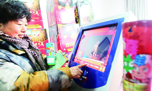 ???1月11日,紹興路一煙花爆竹批發店內,煙花爆竹零售商劉女士正在通過電子查詢系統查看煙花爆竹燃放視頻,該系統不僅可以查詢煙花爆竹的品種規格,還能直觀地看到燃放效果。(記者 何毅)