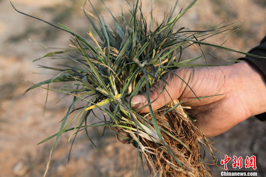 1月24日,在安徽省亳州市譙城區十八里鎮蔣窯村蔣窯莊麥田里,村民正在展示干枯的麥苗。當前,正值安徽省皖北小麥的越冬期,持續的無降水情況造成亳州市各地淺層土壤墑情較差,對冬小麥的生長不利。 劉勤利 攝 圖片來源:CNSPHOTO
