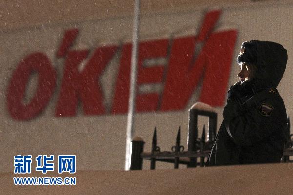 1月25日,在俄羅斯圣彼得堡,當?shù)鼐煸谝患野l(fā)生屋頂塌陷事故的折扣超市門口警戒。新華社/路透