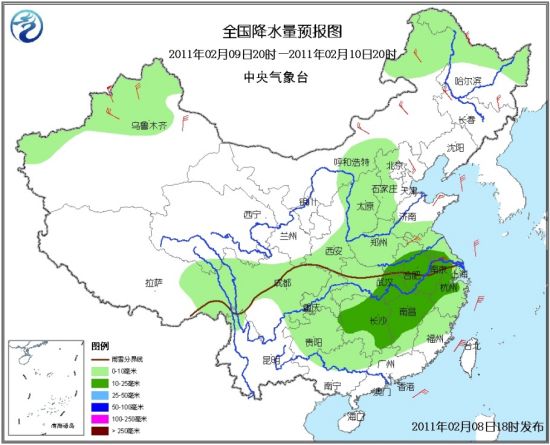 8日20時(shí)至9日20時(shí),新疆西部及天山地區(qū)、青海東部、內(nèi)蒙古東北部、黑龍江北部、西北地區(qū)東部、山西、黃淮西部、江淮大部、江漢、江南西部、四川盆地東部、貴州東部等地有小到中雪(雨)或雨夾雪;內(nèi)蒙古、東北、山東半島有4~6級(jí)風(fēng);渤海、黃海、東海將有6~7級(jí)、陣風(fēng)8~9級(jí)偏北風(fēng)。