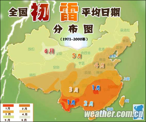 “由于我國南北跨度大,各地春雷始鳴的時間遲早不一。”李小泉翻閱了近40年氣象資料并專門制作了一張全國初雷平均日期分布圖,其上顯示,就多年平均而言,貴州東部、湖南西部和云南南部在1月底前后即可聞雷,而北京的初雷日卻在4月下旬,新疆甘肅等地的部分地區則要等到6月。