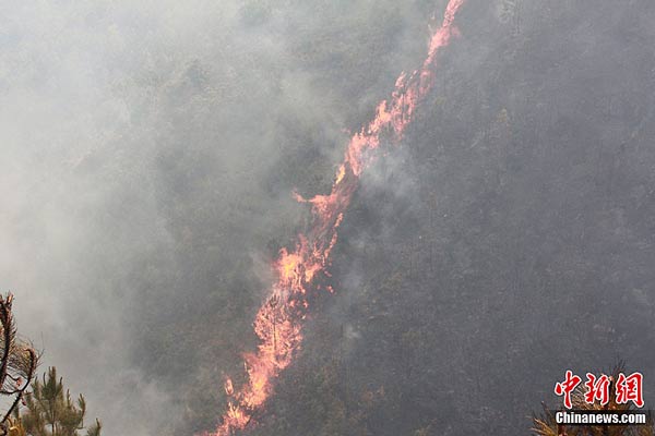 圖為,順山勢蔓延的一條火線。中新社發 楊潤民 攝