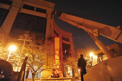 ????昨晚9時許,市城管執法局調集工程車輛和施工人員,開始強制拆除香港中路豐合廣場上的違法立牌廣告。據介紹,香港路周邊業戶違法設立的立牌廣告清除行動正式啟動。