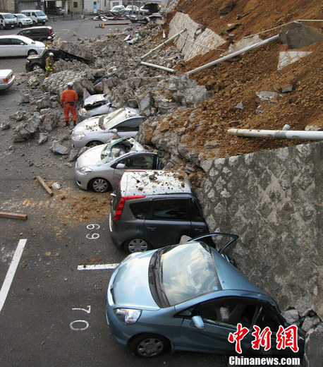 日本近海3月11日發生了強烈地震,首都東京震感強烈。日本氣象廳隨即發布了海嘯警報,稱地震將引發約6米高海嘯。圖為茨城縣某停車場的車輛被倒塌的墻壁壓毀。