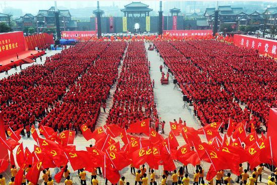 據悉,除萬名黨員宣誓主會場,當地還在九龍坡區第二實驗小學和楊家坪中學設立分會場,兩千名少先隊員和團員分別舉行集中宣誓活動。在飄揚的國旗下,他們用童聲大聲說出入隊、入團誓詞。