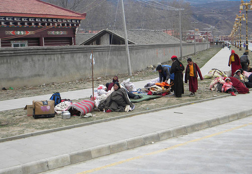 4月10日,四川甘孜爐霍縣藏族群眾在空曠的街道上露宿躲避地震。當日17時02分,霍縣發生5.3級地震,全城停電,部分房屋有開裂現象。新華社發(張子輝 攝)
