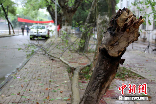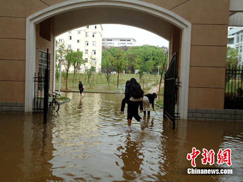 15日下午,南昌市普降大雨,伴有雷電和短時大風,局部降下冰雹。華東交通大學許多新栽種的樹木被強風吹倒,部分學生宿舍進出道路被淹沒,大學生們只能脫鞋趟水行走。