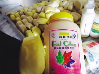 “檸檬黃”、“玉米香精”和成的面是用來制作玉米饅頭的;不加色素的面粉用來制作白饅頭,為增加甜度和香度會加一些糖精和香精。