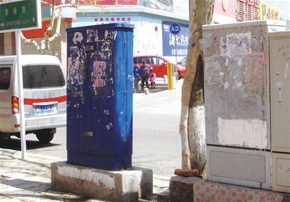 在書(shū)院路上,檢查組步行檢查了不到300米的路面,結(jié)果發(fā)現(xiàn)多個(gè)配電箱、通信設(shè)備箱等外表貼滿了小廣告,箱體非常臟。在書(shū)院路與青峰路路口處,有三個(gè)箱體矗立在人行道上,三個(gè)箱體無(wú)一例外臟亂不堪,外邊被貼滿了小廣告。從現(xiàn)場(chǎng)情況看,箱體外的小廣告被清理過(guò)了,但由于清理不徹底,一個(gè)個(gè)箱體都變成了大花臉,看上去更加刺眼。在昨天的檢查中,檢查組發(fā)現(xiàn),各種電力、通信、有線電視等的箱體普遍存在長(zhǎng)時(shí)間無(wú)人擦洗的情況,并提醒有關(guān)部門及時(shí)處理。