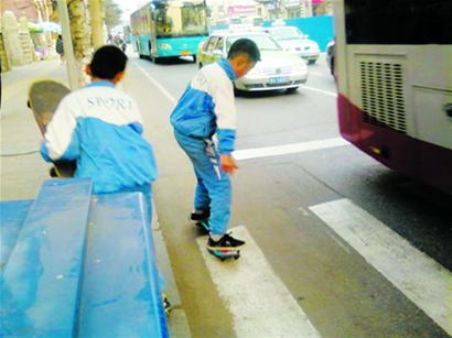 昨日下午4時許,青島市民張先生通過晚報熱線82860085反映,在廣西路與河南路交界處,兩名10歲左右的穿校服少年正足踏滑板沿著廣西路東向西的車道逆向向東滑行。記者接到報料后迅速趕到現場勸告這兩名少年停止了這種危險行為。記者隨后對青島市場上銷售的滑板調查發現,大部分商家銷售的滑板都沒有說明書,屬于三無產品。而且商家都認為,孩子一旦玩滑板出了事和自己無關,該找的是家長。