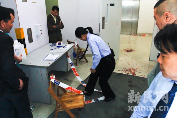 11時許,新民網記者趕到現場,新茂大廈是一棟商務樓,事情發生在該大樓的后門一個類似工作人員通道的地方,地面上全是血跡,工作人員正在用水沖洗。據一名物業管理人員介紹,10時許,一名年輕男子身穿便服,自稱是快遞人員要上樓,保安上前詢問并請他出示相關證件,雙方隨即發生爭執,男子拿出刀將四五名保安捅傷。據一名現場目擊者介紹,他開車途經此地時看見,這名男子已經捅傷5人,其中一人頭部受傷,傷勢較重。